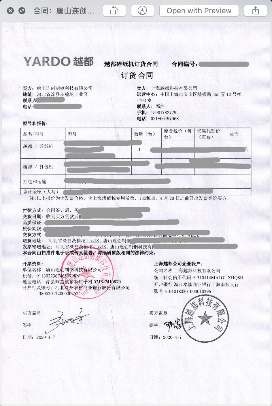 河北省唐山灤縣碎紙機用戶案例:河北省唐山灤縣連創制鋼科技有限公司張總訂購越都涉密粉碎銷毀用碎紙打包一體機產品(粉碎打包一體機)