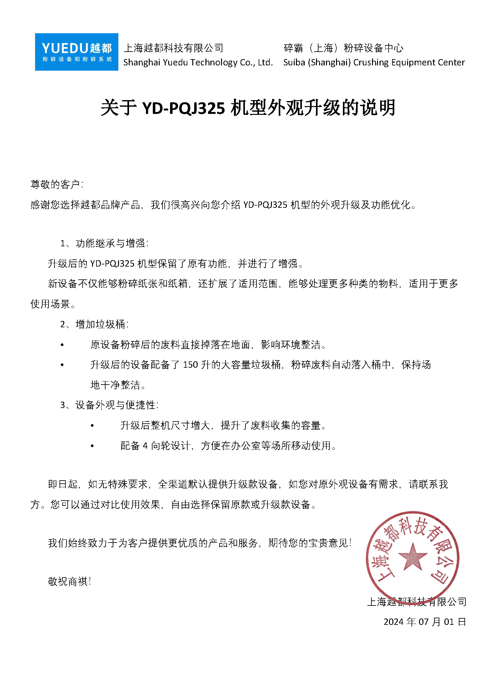 感謝您選擇越都品牌產品,我們很高興向您介紹YD-PQJ325機型的外觀升級及功能優化。